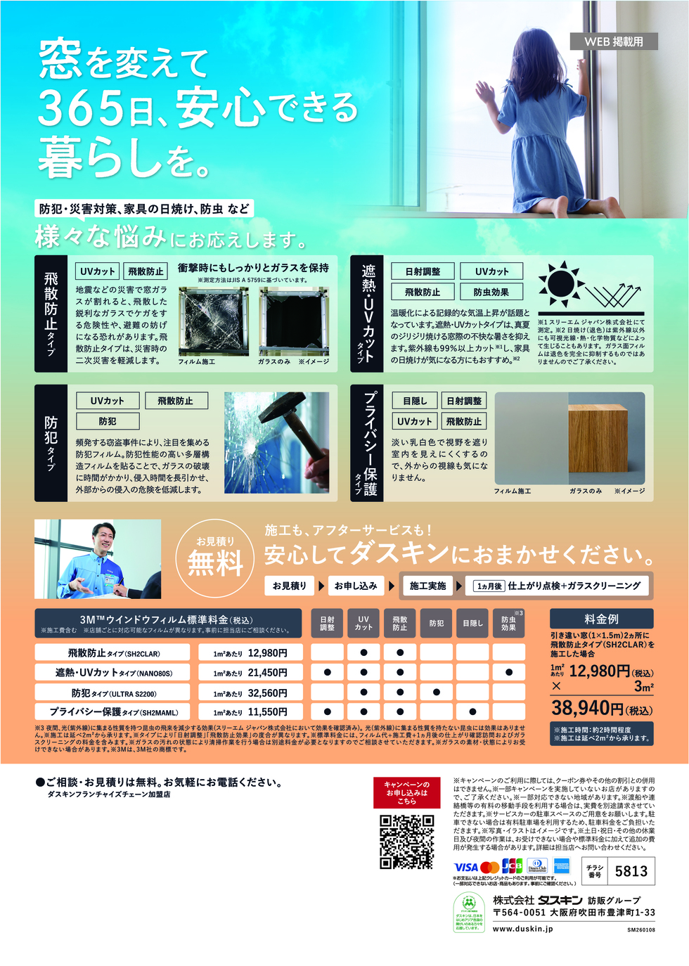 - 家庭向けサービスの「窓用フィルム施工サービス」と同一です。
